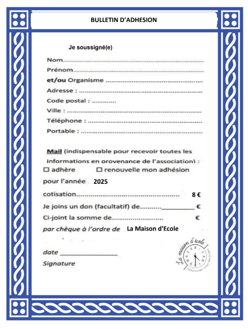🖨️ Imprimer ce bulletin, puis le compléter et l’envoyer par courrier à La Maison d’Ecole accompagné du chèque correspondant.